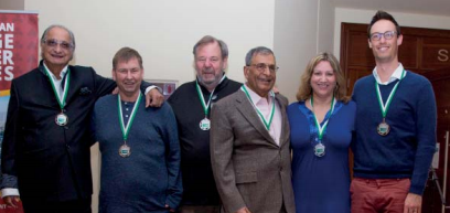Det ble andreplass for fv. Zia, Helgemo, Meckstroth, Gupta, Rosenberg og Lorenzini.