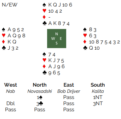 Det er en knallhard utgang, dog med sjanser. Hjerter 8 kom ut til syds knekt. Kalita gikk på sparfargen, og vest stakk andre gang før han skiftet til ruter dame. Spillefører hadde nå åtte sikre (4-1-1-2=8). Kalita stakk med ruter ess og tok sine toppstikk. Etter det så det slik ut: