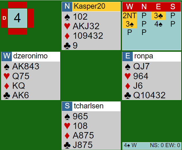 Ved det andre bordet spilte vest 3NT. Nord spilte ut stor hjerter. Nå er det to bet om nord skifter til ruter. Syd vinner med esset, og hjerter gjennom gjør at forsvaret får fem hjerterstikk pluss ruter ess. Nord fant imidlertid ikke det motspillet. Han dengte ned den andre store hjerteren i håp om damen dobbel hos vest, men da stod 3NT!