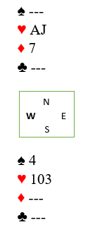 Inne på ruter ess spilles (hvis vest for eksempel har igjen en stor ruter) den siste trumfen. Da oppstår en show-up-squeeze idet spar 4 spilles. Vest må holde ruteren sin og blir nødt til å gå ned på singel hjerter. Dermed vinnes om vest har hjerter dame, eller øst har KQ-dobbel, en lignende show-up variant som ble fortalt forleden i bloggen.