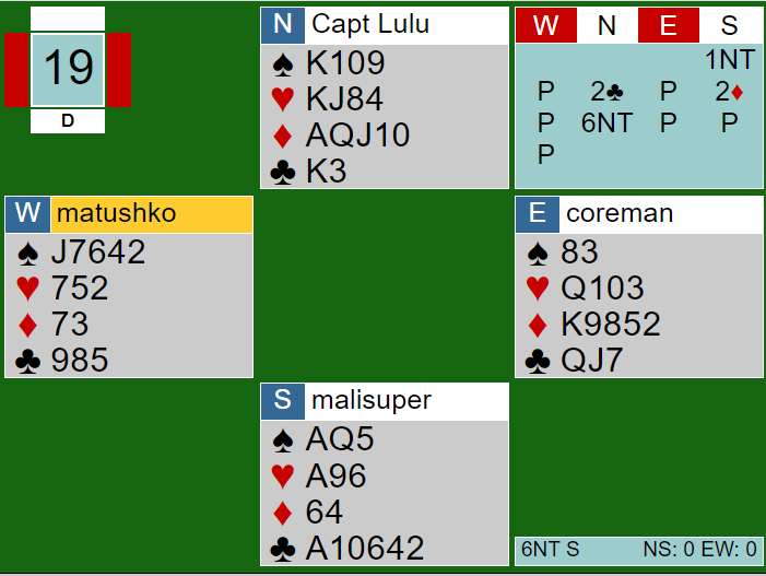 Når Øst er sterk og ikke bruker Stayman tyder det på moderat interesse for majorkontrakt. Mange ville nok valgt ruter ut som gir nærmest paradeløp for Vest, men Arne valgte i stedet å spille ut sp J! Bordet opp med 4- kort spar, bare hagel men likevel, var ikke som ventet, men da makker i Syd kunne legge 3-eren som styrke var mye gjort. Knekten beholt stikket, men hva så videre? Det tok ikke mer enn et par sekunder før sp K lå på PC- bordet og Vest fikk for esset. Kløver fikk løpe til Syd sitt ess og kløver til dame og esset i Syd. På ren opptelling kunne så sp D og sp 8 som sto tas. Senere kunne ikke Vest unngå må gi Marthinussen stikk for kl K som ga bet og faktiskm 86.5% score! Ruter ut kan slippes til knekten og spilles kløver opp må Wyd etter kl A spille spar og Nord må passe på ikke å blokkere. Bet henger da langt ute.