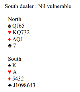 Ved det andre bordet åpnet syd med 4 spar. Idet motparten var i 6 kløver doblet nord. Da syd kanskje litt tivlsomt (?) valgte å spille motspill ble det fattige +300 til N/S, og da ble spillet tapt med 18 IMP.