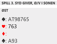 Selv om hjerterutspill er hakket bedre for forsvaret var ruterutspill godt nok siden nok en ruter idet nord er inne på trumfdamen bryter forbindelsen for en fin skvis som ville fungert med for eksempel spar ut.