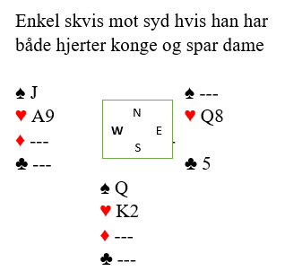 Det elegante sluttspillet kommer ikke helt av seg selv, for spillefører må gjette hvem som har hjerter konge. Hvis nord som her har det kortet og syd altså allerede er plassert med spar dame er situasjonen som tegnet for en tosidig skvis. De må holde hver sin farge, og ingen kan holde den tredje fargen (ruter).