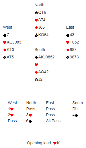 Det ser ut til å være en slem som er avhengig av ruter konge i saksen. Spillefører vet jo ikke hvordan det sitter, men den dårlige nyheten idet blindemann kommer opp er at vest er favoritt til å ha det kortet. Vest har trolig alt av uteværende honnører slik som meldingen har gått her.