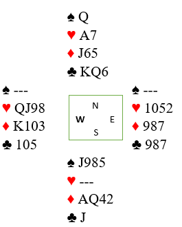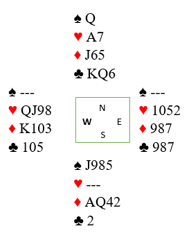 Vest tok altså for kløver ess idet du spilte toeren fra syd, og hadde han ikke gjort det ville han som allerede nevnt ikke fått for det. Det var derfor det var gunstig å la hjerter ess ligge i starten, for det vet ikke hva du ønsker å kaste på det.