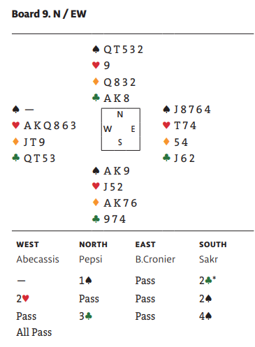 I 4 hjerter var det håpløst selv om spar dame ga stikk og forssvaret ikke kunne få sparstjeling i fargens tredje runde. Ø/V måtte få for kløver ess, og da var eneste sjansen for ti stikk at ruterfinessen gikk bra. Da den røk ble det en bet, og spillet ga 10 IMP til Kina som tok ledelsen i kampen og ledet ganske lart til det gjenstod tre spill. En fin sluttspurt av australerne gjorde at de likevel vant kampen med 5 IMP.