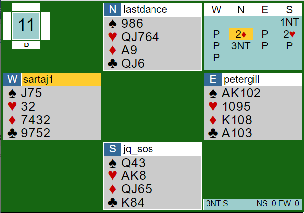Mot 3NT kom spar ut, og da det satt heldig var spar dame en stopper. Ikke bare det, sparfargen satt 4-3, så selv om de fortsatte med spar kunne de ikke få tatt mer enn tre sparstikk totalt, og for kløver ess. Spillefører fikk 1+5+1+2=9 stikk, +400.