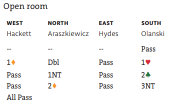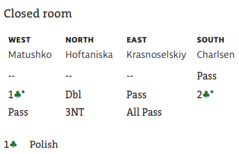 Arne (Ø) passet i gunstig, det samme gjorde Magnus men jeg kunne åpne med 2 hjerter som er en slags Tartan, tofarge hånd med 5 hj og 5+ i en av minorfargene. Wedeendro deretter opp 4 kløver- bud, alertertsom kløver pluss spar. Han fortalte med etterpå at konvensjonen heter «leaping Michals» og det satte fart på budserien. Marthinussen hadde klart til 4 hjerter, Magnus slo til med 4 NT og jeg som var i stampehumør meldte 5 ruter. Johan viste tenner med 6 kløver, Arne sto på videre med 6 hjerter og Magnus prøvde seg med 6 spar. Nå var Vest og Nord utmeldte, men Marthinussen bidro med 7 ruter som ble doblet. Siste bud var på en måte malplasert for 6 spar ser ut å kunne betes? Men siden Magnus i Syd med 7-eren fjerde i spar ville blitt spillefører kan ikke 6 spar betes. Men klarer Magnus med ruter ut til røff å dra hj K? Det vil hindre at 6 spar kan betes for hjerter stjeles hjem og sparfinesse med 2-2 imot går som smurt. 6 kløver av Syd står jo, men bare om Syd er spillefører. De aller fleste fikk spille 5 hjerter av Vest, mange doblet, men 650 inn er bedre enn 300 ut som jeg gikk i 7 ruter doblet med to bet. Beta Tore fikk 16,7% for det!