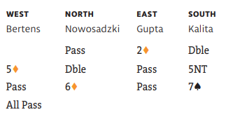 Hvis forsvaret tar de to hjerterstikkene må spillefører for å vinne 5 ruter ta sparfinesse siden damen sitter femte i mot. Vest spilte imidlertid ganske naturlig ut sin single kløver og spillefører fikk det enkelt. Sartaj Hans vant med esset og tok tre runder trumf. Siden forsvaret ikke hadde noen stikk kunne han nå simpelthen spille A-K i spar fulgt av knekten som han kastet en hjerter på. De kunne deretter ta ett stikk i hjerter, men den godspilte spar 10 ga avkast for kløvertaperen. Elleve stikk, +550. Dermed vant altså Australia utgang i begge retninger, og det var verd 16 IMP.