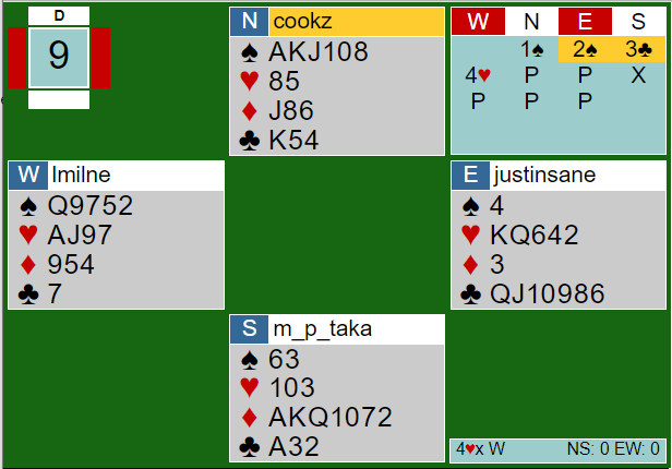 Liam Milne (vest) meldte 4 hjerter over syds 3 kløver som viste ruterfarge. Syd doblet 4 hjerter som ble kontrakten, og nord spilte ut en stor spar. Motspillet var nok ikke så skarpt her, og de kunne vel gjort det litt verre for spillefører enn de gjorde da nord skiftet til ruter som syd vant før han tok for kløver ess. Nå fikk Milne stjålet god kløverfargen, og han tapte kun de tre første stikkene. Ti stikk og en knallfet +790 til bokføring.