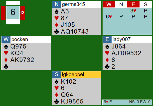 Det er vel enkelt, 6 hjerter av Nord så klart. Da er sp K beskyttet og uten spar ut blir det lett 13 stikk! Arne Marthinussen (N) var det etter litt pokeraktig meldesekvens av undertegnede. KL 9 ut løp til 10.eren, trumf til aeest og Vest var utsolgt. Hadde slevsagt ikke 4- kort i kløver og Øst med sp AJ10- hj DJ2. ru D87654- kl 8 fikk beten og 80% score. Surt, men slik skal også bridge være.