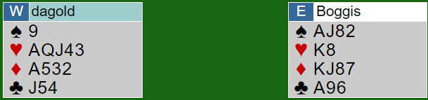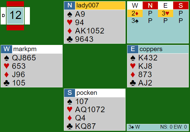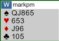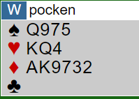 Så noen spilleksempler. Ca kl 11.30 starter turneringene «Nordpolen» med Toska, Tommy Skavik fra Saltdal, som leder. Trolig er det overvekt av spillere fra nordlige strøk, men andre kan ved forespørsel bli akkreditert for spilling. Terje Solli som p.t. er koronafast på landstedet i Sør- Frankrike og undertegnede spilte onsdag og måtte god motstand i IMPen etter en MP- turnering med flott score i Sissill sin Hyggebridge før denne.