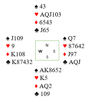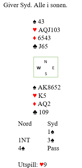 Syd og alle. Jeg og Vest passer før Solli åpnet med 1 kløver og Øst hoppet innpå med 2 spar. Jeg doblet negativt som lover 4+ hjerter, 3 spar fra Vest og 4 hjerter nordfra. Pass fra Øst og meg men Vest hadde til 4 spar. Da Terje passet var det jo krav og med tilpasning i kløver valgte jeg å melde 5 hjerter. Sp A ut og skift til kløver og det hjalp men kontrakten var veldig usikker. Går det ann å vinne, for det er vel to tapere i ruter? Terje vant 2. stikk på hånden, tok ut trumfen og alle stikkene i kløver. Så ruter til esset og mer ruter og damen kom på fra Øst som nå var innspilt og måtte spille til dobbeltrenons. Østx talte ikke opp! Terje viste under veis 4 hj+ 4 kl og 1 spar og hadde dermed 4 kort ruter også. Da ser Øst at det blir innspill i rutert, ergo må ru D legges under esset! Det beter, for Vest sitter på K10x i ruter og får to stikk der. Elementært, men kanskje Nord allerede i 3. stikk burde tatt for ruter esset. Da er Øst i Verdensklasse om ru D blir avblokkert!
