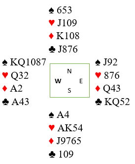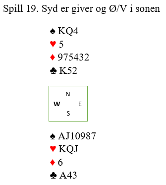 Da spillet forekom, i 4 spar ved mange bord, og i 5 spar ved enkelte bord var flere spilleførere for raske på labben og startet med å ta ut trumfen. Det er en typisk feil som ofte skjer når man har veldig fet og god trumffarge, det ser liksom så enkelt ut, og å ta ut trumfen med det samme er jo i mange spille riktig spilt. De glemte å stille seg det viktige spørsmål som alltid bør stilles før en går i gang å spille trumfkontrakt: «kan jeg ta ut trumfen nå med det samme, eller må jeg vente med det fordi jeg skal bruke trumfen til noe?». Svaret kan være «nei» på det spørsmålet hvis trumfen på den ene siden, ofte den korteste trumfhånden må brukes til å trumfe opp en eller flere mulige tapere. Slik så hele spillet ut: