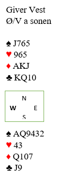Her et spill som egentlig tvang seg fram, men se på hva Tom Gjøs i Syd skulle spille ut fra, og hva ville du gjort? Arne Marthinussen i Vest hadde åpnet med 1 ruter, pass fra Lars Helgesen i Nord og 1 NT (6-9/10 utren major 4- farge) og så gjenmelding 3 ruter fra Arne som undertegnede løftet til 3 grand med to ess, det burde rekke selv om majorbeholdningen var skral..