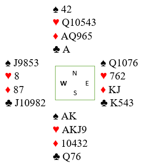 Det ene N/S paret 7 hjerter! Spillefører startet med liten til damen og lyktes, tretten stikk og en massiv +1510! Ved det andre bordet meldte N/S 6 hjerter. Der spilte også spillefører liten til damen da hun ikke kjente igjen safevarianten. Så der ble det også tretten stikk, +1010.