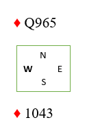 På ruter ess kommer kanskje ingen honnør på. La oss si de følger med åtteren og syveren. Da spiller du deg over til syd og spiller ruter mot Q-9-x-x gjenværende. Dette er situasjonen etter ruter ess er spilt og ingen honnør kommer på: