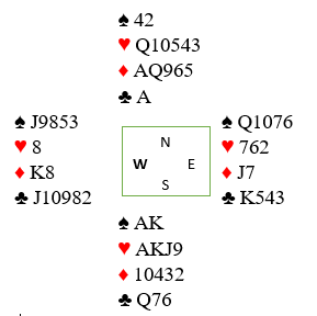 Vi tenker oss altså at under esset fulgte de med åtteren og syveren. Du spiller deg over til syd og spiller liten ruter mot nord. Så lenge øst ikke har K-J tredje fra start (uløselig kombinasjon for deg) må vest nå følge med enten knekten eller kongen og begge deler gjør at du har sikret deg at det blir kun en rutertaper.