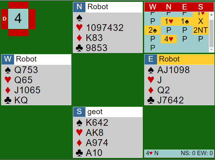 Det ble bedre å vise styrken, for over 2 NT tok robot-makkeren en fresk og god, dog knallhard avgjørelse med 4 hjerter siden han visste om trekorts støtte og 18-19. Hardt meldt synes du med 3HP? Ja, men jeg liker nords kortvudering her. Han (hun?) har 6-4 fordeling og renons i motpartens farge, og han/hun vet om en nikorts trumftilpasning