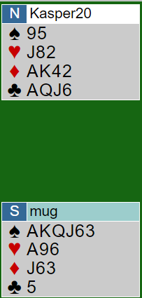 Merk den enorme dobbeltilpasningen (begge sider har tilpasning i to farger) det er i dette spillet. Det er ti enkle stikk i spar N/S, og Ø/V har elleve stikk i hjerter!