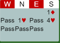 Makker Tone Annette åpnet som Vest i 2. hånd med 3 ruter som var avtalt med 7+ farge med to av tre høyeste honørene (men med AJ10 på topp og ess i tillegg kan det reduseres mht fargekrav). Jeg (Ø) meldte deretter 3 spar, krav og makker skal da med Hx eller bedre melde 4 spar, med to små melde 3 NT og uten dette gjenta sin egen farge. Men jeg syntes hånden var god, det er lite som trengs for utgang og satset derfor på 4 spar som fikk stå. Kløver ut som jeg valgte å stikke i bordet for å spille trumf. Spent på hvilken trumf Nord hadde å by på ble gedigen skuffelse da det kom sak av liten kløver! Trumfen satt altså 6-0 imot og det var bare å forsøke å gå så få beter som mulig. Men -3, altså -300 i score var alt jeg klarte, og det ga oss -2 i score. De fleste var som oss utpå i dårlige kontrakter slik det satt.