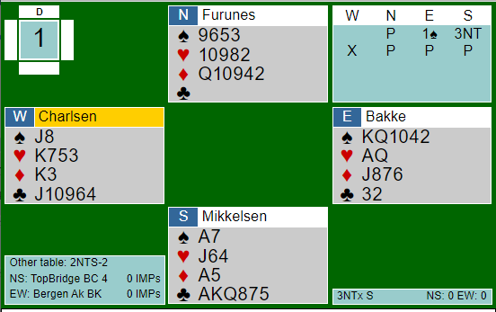 Det er altså spill 1 så nord er giver og ingen i sonen. Nord passer, øst åpner med 1 spar og det er syd sin tur.
