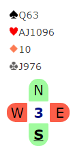 Brekka (øst) hadde gode kort, men han syntes det var litt for drøyt å melde inn 4 spar med KQ tynt femte. Så han passet, og etter pass fra syd også doblet Fuglestad (vest) opplysende. Nå mente Brekka det måtte være slem i kortene, og han hoppet til 5 grand som er såkalt «pick a slam», dvs. det er flere mulige steder å spille. Vest foreslo 6 kløver, og øst korrigerte til 6 ruter som betyr at han har spar og ruter. VEst hadde et greit valg da (mellom spar og ruter) og det gikk pass rundt. Syd skulle spille ut.