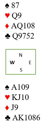 Det er i tillegg til spar ess fem kløverstikk og ruter ess, syv sikre. Det er mulig vinne to-tre ekstra ruterstikk hvis vest har ruter konge. Det er også mulig å vinne to hjerterstikk ved å presse ut esset, og det er ufarlig hvis sparfargen sitter 4-4, de har jo i så fall kun ett godspilt stikk der og i så fall totalt kun fire motspillstikk.