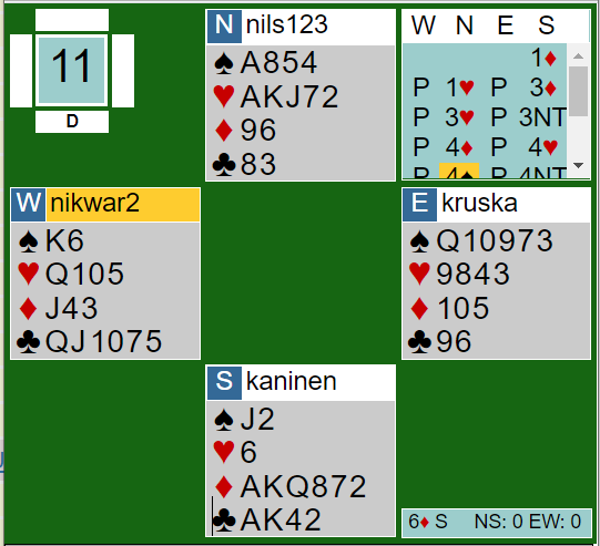 Brekka hoppet til 3 ruter. Siden det fikk satt fokus på ruterfargen/lengden og styrken førte det til at Kvangraven ble sleminteressert med kun 9-x i ruter.