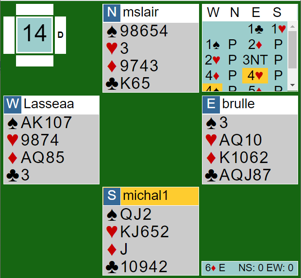 Tirsdag med RealBridge i Fredrikstad/Namsos kom en ny variant. Tone Annette Olsen (S) var da min makker og vi møtte Gorm Norstad (Ø)- Jan Talberg (V). Jan var giver i ugunstig sone og åpnet med 1 ruter, jeg hoppet innpå med 4 hjerter og så skulle Gorm melde. Hva ville du valgt med de 10 poengene, åpningen lovte 4+?