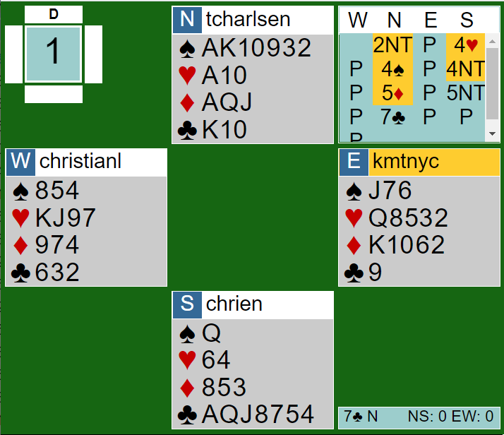 . Atle fortsatte med hj K og liten trumf til bordet. På kl 4 la Nord lavt og Atle det samme så jeg fikk på 9-eren. Ruter gikk så til stjeling og da liten kløver ikke felte noe fra Syd kunne ikke kontrakten lenger vinnes.