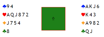 Lite trolig, for i så fall har nord syv eller åtte kløver, og han ga ikke lyd fra seg verken i åpning eller etter 1 ruter (øst), 1 spar fra syd og 2 hjerter fra vest. Etter det hoppet øst til 4 hjerter. Kan nord ha fire ruter?