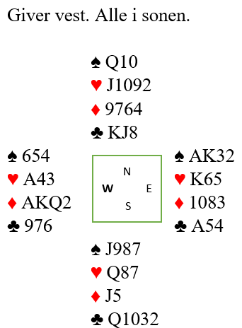 Der Per Lorentzen satt Vest kom innmelding 6 ruter, det samme gjorde Egil Hansen. Noen andre prøvde å melde konstruktivt, ved å doble og på makkers svar 2 kløver eller 1 NT kreve videre med 2 spar. Da Sjur Nedrebø over makkers forcing bid svarte 3 NT slo like godt Jan Egil Karlsen til med 6 grand som de eneste. 9 andre landet i 6 rutyer. Mot oss det Rolf Normann Hansen hadde åpnet med 1 spar, jeg doblet og Simon Ratmussen sperret med 3 spar var jeg sjanseløs, hoppet til 5 ruter men Arne klarte ikke å løfte. Min hånd har jo 3 tapere, ikke lett å vurdere. Men i 6 ruter vinner man 13 stikk ved å stjele siste hjerter og ta finesse i kløver. Det ga 46-6 mens 6 NT med 12 ble belønnet med 52-0. Syd hadde sp KD862- hj DJ742- ru 7- kl K2.