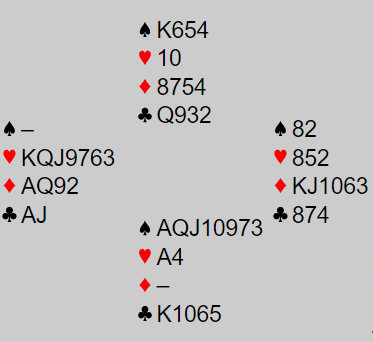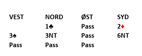 Kløverutspillet ga spillefører ett ekstra stikk, og spillefører simpelthen satte opp ruterfargen, tolv stikk og N/S +1440. Men det ekstra kløverstikket behøvde han for så vidt ikke siden han kan få tre sparstikk slik det sitter, og det er nok til å vinne tolv etter å ha satt opp ruteren, 3+1+5+3 = 12. Det han behøver er imidlertid å unngå hjerterutspill. Finnes det utspillet er det umulig å vinne 6 grand.