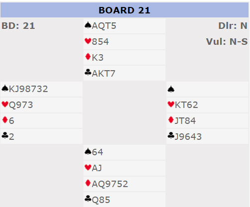 En glimrende storeslem. Veldig få fant frem til 7 spar, og de som gjorde det tok nok bare en sjanse med vests kort, en ikke så hårreisende gambling da øst må ha noen honnører i kløver/hjerter for å ha for sin splinter-melding. Men det var flere i utgang (!) enn i slem, så de som var i 6 spar med tretten stikk fikk 62%, bra betalt.