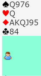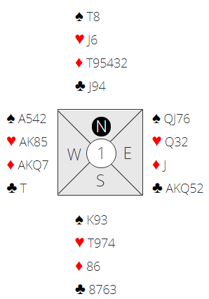 I 2. hånd med alle i farersonen ble det naturlig å åpne med 1 hjerter og makker Tone Annette Olsen svarte da 2 NT, krav (minst utgang) med støtte 3+ i hjerter. Det var hyggelig opplysning og potensiale for høy kontrakt økte voldsomt. Da spurte jeg like godt i 4 NT etter hvor mange av de 5 key Card-ene makker hadde. 5 kløver fra Olsen viste 0 eller 3, men det var opplagt at hun måtte ha tre. Da kunne jeg bekrefte samtlige 5 på plass med 5 NT som spør etter ekte konge nedenfra. Men makker bøyde av med 6 hjerter. Da visste jeg at vi mangler ru K, men sp K er det mulig at hun har. Hva ville du gjort, passe på 6 hjerter eller våget løft til 7 hjerter? Jeg vurderte men avslo å gå høyere.