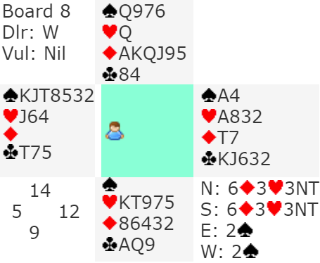 Men så viste det seg at bare 2 til av de 28 bordene var i slem og da fikk vi 2-50 tap på spillet. Bittert, men bridgen er såpass rund at man får tåle nedturer som denne. Nytt spill takk!