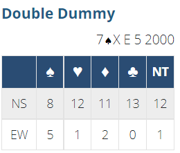 Par på spillet (det maksimale som kan oppnås er +2000 til N/S, noe de kan få om Ø/V stamper i 7 spar som selvsagt dobles. Å oppnå parscore, det optimale, som er at Ø/V går 2000 i bet (ingen hadde det), ville imidlertid gitt nest bunn for Ø/V i mix-NM.