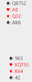 Du har jo 11 omtrent 100% sikre stikk, men hva har makker til hjlp? Faren er at trumfen ikke sitter uten at det blir taper der og har makker en konge er det alltid lilleslem. Men hvordan få meldt? Terje Solli og jeg bruker tvetydig avslag på kravåpningen 2 kløver med ikke «seckond neg» på åpners fargegjenmelding, og da bestemte jeg meg for å vise ekstrem styrke i poeng og spillestyrke ved hopp til 5 hjerter, men Solli passet likevel ned. Og normalt vil det være høyt nok?