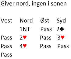 Han så dette meldingsforløpet hvor nords 1NT var 15-17 og de videre meldingene standard Stayman og invitt til utgang som ble løftet. Hva ville du spilt ut nå?