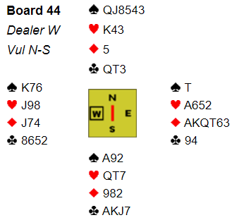 Øst kunne kanskje i stedet for å doble sagt 5 kløver. Det blir kostbart det også, kanskje litt billigere enn 5 ruter doblet hvor det ble fire doblede bet med to spartapere, en hjertertaper og tre rutertapere, N/S +800. På en måte reddet vest 80 poeng i forhold til å la syd spille 4 spar redoblet.