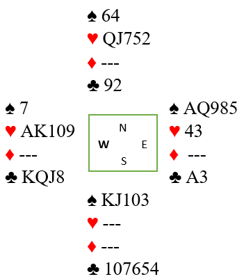 På fire runder kløver og fire runder ruter må han finne to avkast. Hvis han kaster to hjerter har han kun en hjerter-stopper. Da blir det enkelt, spillefører gir simpelthen bort ett stikk i den fargen og får senere tre hjerterstikk.