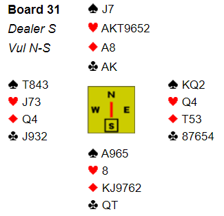 Arne Marthinussen i Nord valgte åpning på meget tynne fliser, men fordeling passet og 2 hjerter som ikke viste svake to men en sak tofarget hånd. Øst gikk innpå med 2 spar og jeg satt i Syd med super støtte og hoppet rett til 4 hjerter. Litt overraskende var det at Vest doblet, men takk for det!
