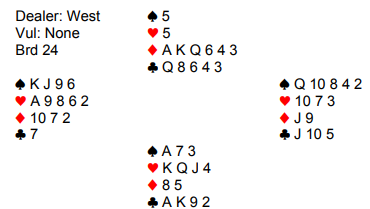 Arild hadde meget sterke kort, på grensen for åpning 2 kløver, men valgte anlig fargeåpning 1 kløver, 3+ og Vest gikk innpå med naturlig 1 ruter, 5+. Atles hopp til 2 spar viste 6 kort sparfarge med styrke 0-5 poeng mens Øst sitt hopp til 4 rutertrolig ar sperrebetonet. Simonsen er ikke skuggeredd og smelte til med 6 spar oer dette, eneste svake punkt er jo i hjerter og ellers var toppkort og fordeling med tilpasning ypperlig. 6 spar vinnes også siden Nord lett får godspilt bordets 5. kløver for avkast av den ene lille hjerteren. Men Moss valgte å safe over motpartens lilleslem og stampet i 7 ruter! Det ar god stamp over 980 som «Nedre Glomma» ville fått, for 4 bet kostet bare 800 ut. Likevel ga resultatet fra det andre bordet der Magnus og Flemming fikk spille 4 ruter av Vest med bare en bet et stort svingspill med solid pluss for puljevinnerne!