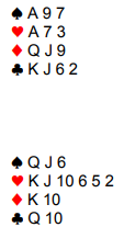Noen veldig få fikk elleve stikk i hjerterutgang (tippet hjerteren). Resten spilte 4 hjerter med ti stikk. Alle ville fått elleve i trumfkontrakten hvis hjerteren hadde løst seg enkelt, men da ville vi scoret de deilige 10 poengene ekstra, 460 mot 450. Så her ble det en forsmedelig bunn hvor det fort kunne blitt en topp uten å ha gjort noe spesielt bra.