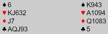 Merk at syd åpnet med 11 poeng og balansert hånd. Dette er et stilspørsmål og det ene behøver ikke være mye bedre enn det andre. Jeg har sansen for åpning med dette, men liker det ikke med 4333 hender. Det er fine honnører, 4432 hånd, og han har spar som er høyeste rangerte farge. Men slikt blir litt gi og ta, og syd som passet i åpning ved det andre bordet kan ikke klandres for det.