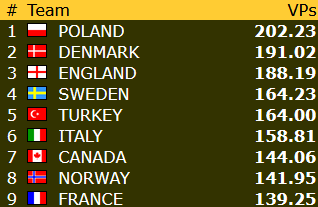 Norge har 113,23 VP etter 13 av 23 runder, og ligger foreløpig på 19.plass blant de 24 lagene. Avstanden opp til åttendeplassen er drøyt 32 vinnerpoeng.