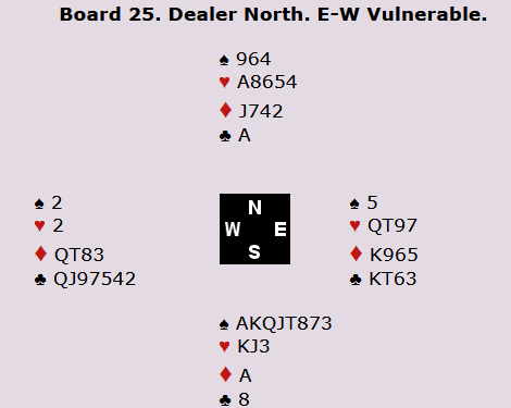 I spill 25 åpnet Boye med Halles 2 kløver med den spillesterke hånda i syd. Vest gikk inn med 3 kløver før Christian meldte 3 hjerter, som viste (minst) 5-kortsfarge og ei positiv hånd. Øst støttet så til 4 køver, og Boye hadde ikke akkurat noen dekkende melding. Han gjorde et praktisk hopp til 6 spar. Christian tenkte seg litt om før han passet ned. Som vi ser står storeslemmen i praksis på finessen i hjerter, som aktuelt går. Vest spilte ut sin single hjerter, og dermed kunne Boye kjapt kreve alle stikkene. Også ved det andre bordet var kontrakten 6 spar, og dermed ble det buttspill.