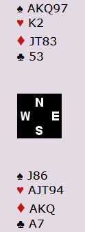 Boye i syd fikk vite at makker ikke hadde hjerterstøtte, men fikk senere høre at makker hadde ess-konge-dame spar, samt hjerter konge. Dermed var det gode muligheter for at hjerteren kunne godspilles for tretten stikk, og Boye meldte storeslem i spar.